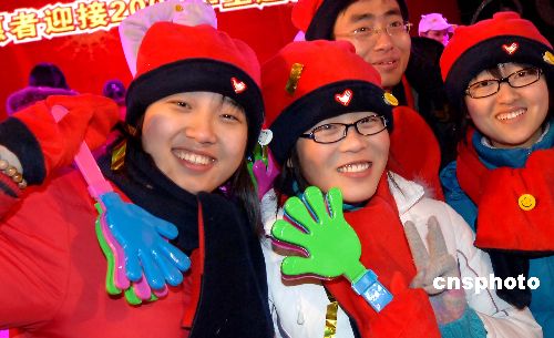 北京:2009年元旦零時(shí)到來(lái)時(shí)刻,北京600多名志愿者及社會(huì)名流在鐘鼓樓廣場(chǎng)聚會(huì),參加北京志愿者協(xié)會(huì)等部門(mén)共同舉辦的“微笑北京,和諧先鋒”主題活動(dòng),并狂歡慶新年到來(lái)。此活動(dòng)是600名志愿者和社會(huì)名流參會(huì)。北京奧運(yùn)會(huì)期間,10萬(wàn)賽會(huì)志愿者、100萬(wàn)社會(huì)志愿者、40萬(wàn)城市志愿者和20萬(wàn)拉拉隊(duì)志愿者在各類服務(wù)領(lǐng)域累計(jì)服務(wù)超過(guò)2億小時(shí)!≈行律绨l(fā) 鄒憲 攝
