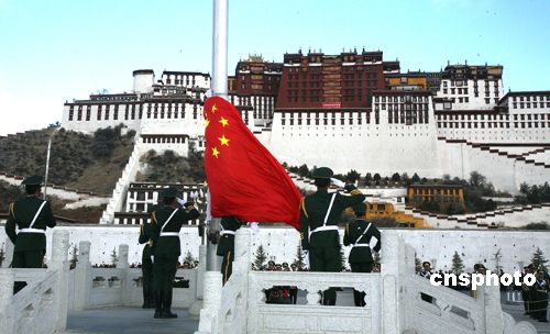 西藏:1月1日上午10點(diǎn),西藏自治區(qū)黨政軍及各屆人士在布達(dá)拉宮廣場(chǎng)舉行“升國旗唱國歌”儀式歡慶新年。中新社發(fā) 賈長飛 攝