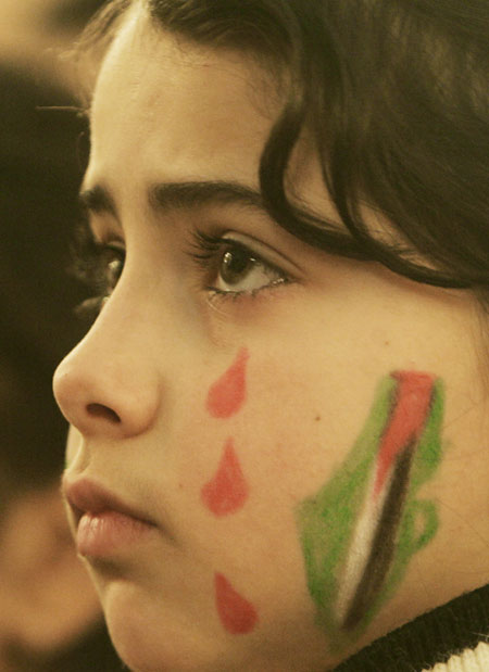 12月31日,一個臉上畫著國旗的巴勒斯坦小女孩在西岸城市拉馬拉為和平祈禱。面對國際社會巨大壓力,以色列仍然拒絕停止對加沙地帶的大規(guī)模空襲,最新統(tǒng)計數(shù)字顯示,空襲已造成至少400人死亡,近2000人受傷。