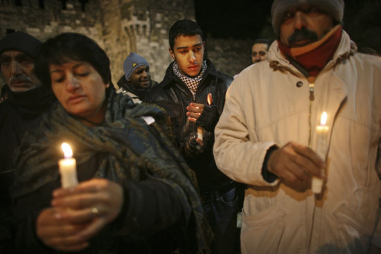 12月31日,巴勒斯坦居民手持蠟燭在耶路撒冷老城舉行集會,以示對加沙支持。聯(lián)合國安理會12月31日晚應阿拉伯國家的要求召開緊急會議,討論巴以沖突問題,但沒有達成一致意見。