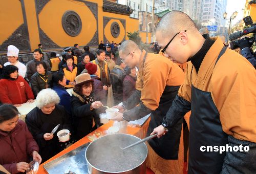 1月3日,適逢中國農(nóng)歷十二月初八傳統(tǒng)的“臘八節(jié)”,上海佛教界向民眾首次施贈臘八粥。圖為一大早,數(shù)千市民在百年古剎玉佛禪寺山門前排起長隊,等候品嘗熱氣騰騰的臘八粥,祈福來年國泰民安。