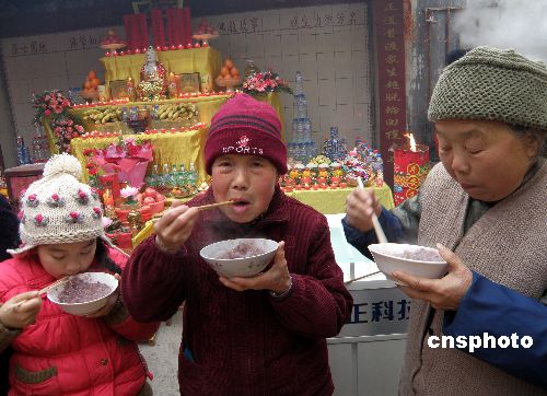 2009年1月3日,農(nóng)歷臘月初八,是中國(guó)傳統(tǒng)的臘八節(jié),湖北宜昌三峽古佛寺里準(zhǔn)備了豐盛的臘八粥,眾多名市民在古佛寺里喜吃臘八粥。據(jù)悉,臘八粥又稱佛粥,與佛祖釋迦牟尼得道成佛有關(guān)。臘八粥在民間被視為吉祥食品,寓意一年之末的大豐收及來年風(fēng)調(diào)雨順,吉祥如意。中新社發(fā) 劉君鳳 攝