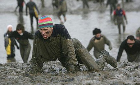 英國泥潭賽跑大賽始于上世紀(jì)70年代,當(dāng)時(shí)埃塞克斯郡的Queen's Head酒吧經(jīng)常有人從河對(duì)岸趟水過來喝啤酒,之后渾身是泥地返回,然后用水沖掉身上的泥。這段經(jīng)歷便發(fā)展成了一個(gè)比賽項(xiàng)目。