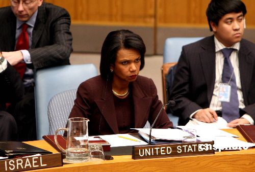 聯(lián)合國(guó)安理會(huì)一月六日晚就加沙局勢(shì)舉行緊急會(huì)議。美國(guó)國(guó)務(wù)卿賴斯出席會(huì)議。中新社發(fā) 李靜 攝