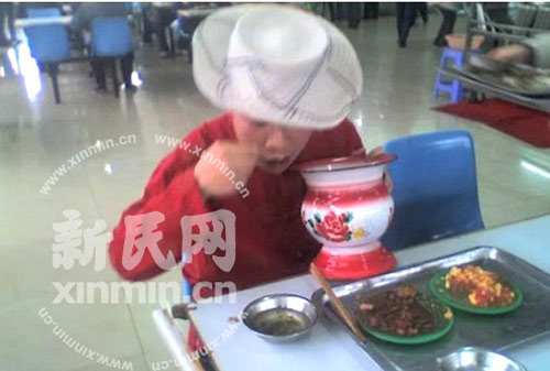 新民網(wǎng)在某知名論壇上看到了該圖片,圖片中,一名頭戴白帽的紅衣男子正在食堂用餐,其左手端著的碩大的紅色痰盂顯得異常刺眼,記者注意到,該男子使用的筷子,飯盆等均為滬上高校食堂內(nèi)常用的款式,而桌上的菜肴也是經(jīng)典的校園菜“番茄炒蛋”和“紅燒肉”。