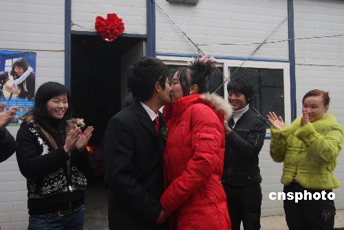 1月6日,地震重災(zāi)區(qū)北川縣曲山鎮(zhèn)王家坪八組王昌明和妻子史悅在安置的板房里舉行簡樸而隆重的婚禮,許多親友和地震災(zāi)區(qū)的群眾送來對他們新婚的美好祝福,在新年里給當?shù)貫?zāi)區(qū)帶來了喜慶氣氛。
