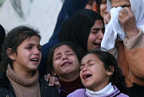 巴勒斯坦人7日大規(guī)模悼念因以色列空襲聯(lián)合國(guó)學(xué)校被炸死的民眾,悼念活動(dòng)現(xiàn)場(chǎng)擺放著其中43人的尸體。共有48人在空襲中喪生。