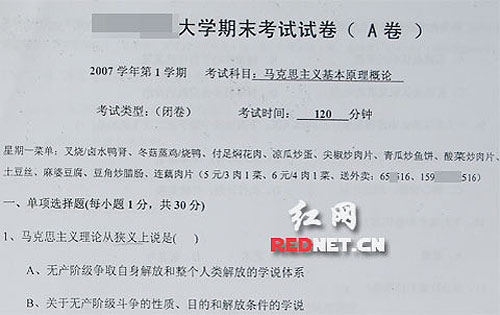 “星期一菜單:叉燒鹵水鴨腎,冬菇蒸雞燒鴨……”近日,一篇題為《受不了了!最雷人的大學(xué)試卷印有外賣廣告》的帖子在網(wǎng)上流傳,從帖中圖片可以看到廣州某高校期末試卷每一頁的空白部分印著快餐店的外賣廣告,試卷上顯示的是2007學(xué)年第1學(xué)期,考試科目為馬克思主義基本原理概論。這份“史上最雷人的大學(xué)試卷”立刻成為網(wǎng)友議論的焦點(diǎn)。
