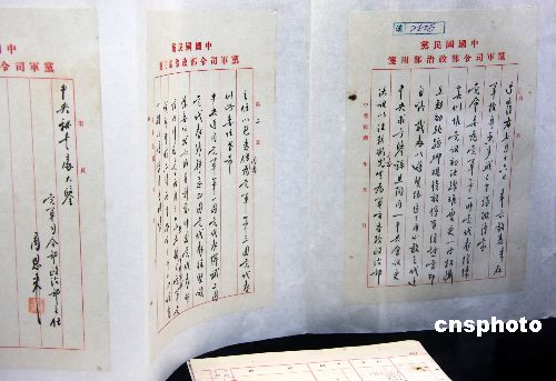 圖為周恩來擔(dān)任國民黨黨軍司令部政治部主任時,于一九二五年七月致中央秘書處的函。中新社發(fā) 陳立宇 攝