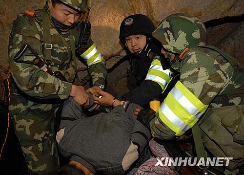 公安干警和武警戰(zhàn)士正在對山洞中地下兵工廠內(nèi)的犯罪嫌疑人實(shí)施抓捕。劉潺 攝