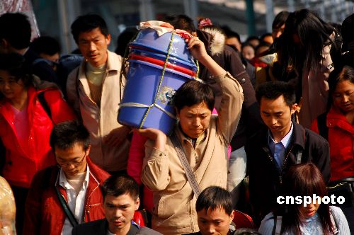 2009年1月10日,重慶北火車站迎來第一波春運(yùn)客流高峰。由于外出務(wù)工人員提前返鄉(xiāng),各大高校開始放假,民工流和學(xué)生流融合,重慶火車站在春運(yùn)前夕迎來了首個(gè)客流高峰,重慶市各大汽車站、火車站當(dāng)日都增開了加班車和臨客。2009年全國(guó)春運(yùn)從1月11日開始,到2月19日結(jié)束,共計(jì)40天。中新社發(fā) 許康平 攝