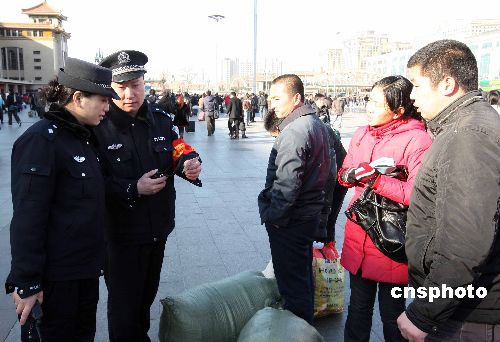 1月11日,2009年春運正式開始,北京警方啟動“服務旅客、平安春運”活動,為旅客發(fā)放安全提示卡,張貼海報介紹購票、乘車等出行注意事項,確保市民度過一個安全、快樂的春節(jié)。中新社發(fā) 任海霞 攝