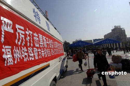 福州火車站廣場(chǎng)張貼舉報(bào)電話嚴(yán)打票販子。