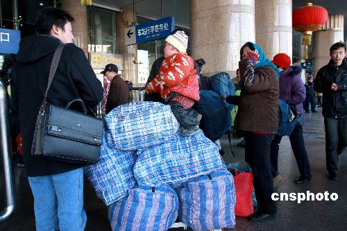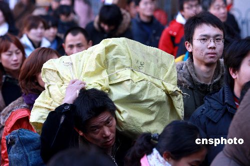 1月11日,為期40天的中國2009年春運(yùn)正式開始,春運(yùn)客流壓力依然很大,客流的剛性需求特征十分明顯,預(yù)計(jì)全國鐵路旅客發(fā)送量將達(dá)1.88億人,比去年同期增長8%,日均470萬人,春運(yùn)“一票難求”的問題仍突出。圖為北京西站的客流不斷。