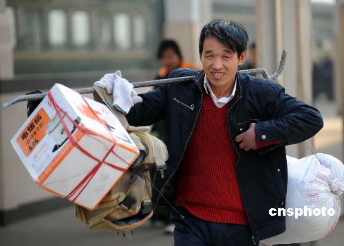 安徽亳州火車(chē)站上旅客用鋼筋打扁擔(dān)挑著自己的行禮。中新社發(fā) 張延林 攝