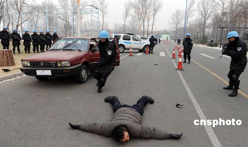 維和防暴隊(duì)員進(jìn)行定點(diǎn)查車訓(xùn)練。中新社發(fā) 由永懷 攝