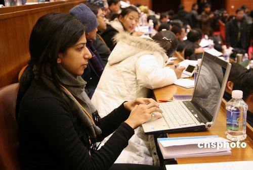 圖為印度女記者在現(xiàn)場進(jìn)行采訪報道。中新社發(fā) 賈長飛 攝