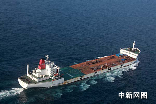 被護(hù)商船“振華十三”號在甲板上寫著“向人民子弟兵致敬”幾個(gè)白色大字。