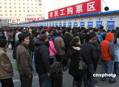 1月15日,北京西站廣場春運農(nóng)民工售票窗口前,成千旅客提前多天排隊購買返鄉(xiāng)列車票,購票秩序良好。北京西站迎來春運“農(nóng)民工返鄉(xiāng)流、學(xué)生流、探親流”的客流高峰,預(yù)計春運期間每天到發(fā)旅客列車約280多列,客流高峰時可達(dá)20萬人次,平均每五分鐘發(fā)一趟列車。中新社發(fā) 鄒憲 攝