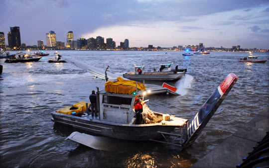 1月15日,在美國(guó)紐約的哈德遜河上,救援人員對(duì)墜河飛機(jī)上的乘客實(shí)施營(yíng)救。