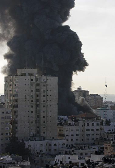 聯(lián)合國(guó)近東巴勒斯坦難民救濟(jì)和工程處位于加沙城的辦公地點(diǎn)遭以軍炮擊后煙霧沖天。