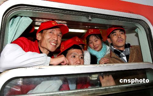 福建省首趟農(nóng)民工返鄉(xiāng)專列(福州—成都)1月15日11時(shí)38分啟程。在福建省總工會(huì)、中國移動(dòng)福建公司、南昌鐵路局福州辦事處等多個(gè)部門的關(guān)心下,來自四川、陜西等地的650多名在閩務(wù)工人員,乘坐由福州開往成都的K392次列車踏上返鄉(xiāng)過年之旅。其中20名家在四川地震災(zāi)區(qū)的農(nóng)民工還獲得免費(fèi)車票。中新社發(fā) 楊婀娜 攝