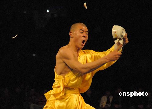 圖中武僧用一根手指連破十來個(gè)瓷碗,令觀眾嘆為觀止。中新社發(fā) 劉冉陽 攝