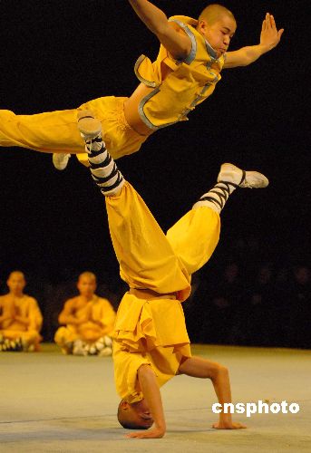 圖為少林武僧表演功夫—少林武集,武僧們精湛的武藝博得全場觀眾陣陣掌聲。中新社發(fā) 楊洋 攝