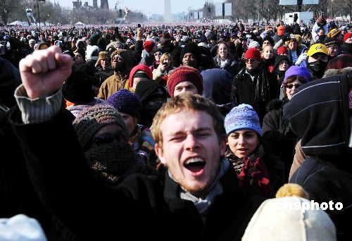 圖為在場民眾振臂高呼奧巴馬競選名言“Yes! We Can”。中新社發(fā) 邱江波 攝