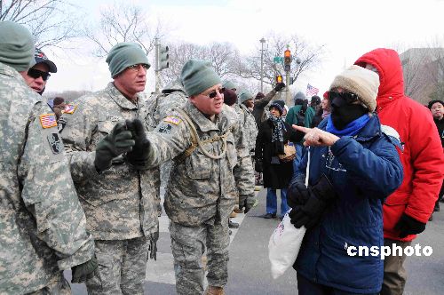 為應(yīng)付突發(fā)事件,協(xié)助警方維持秩序,當局出動萬名國民警衛(wèi)隊官兵站立街頭,協(xié)助維持就職典禮秩序。圖為士兵為迷路者指路。中新社發(fā) 邱江波 攝