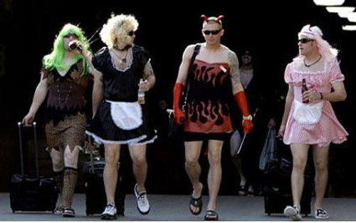 美國(guó)奧克蘭運(yùn)動(dòng)家隊(duì)08賽季表現(xiàn)很糟糕。9月24日晚,在阿靈頓的一場(chǎng)棒球比賽中,他們輸給了德克薩斯騎警隊(duì)。根據(jù)球隊(duì)的傳統(tǒng),新秀球員要穿著搖曳的女裝回家。