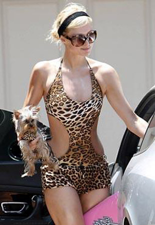 愛出風(fēng)頭的帕麗斯·希爾頓不僅要把自己打扮得漂漂亮亮,就連她的寵物狗也不放過。帕麗斯外出時穿上一套性感的豹紋裝,并給她的寵物狗也穿上了一件同款豹紋裝,上面還帶有一條黑色的蕾絲裙邊,十分搶眼。