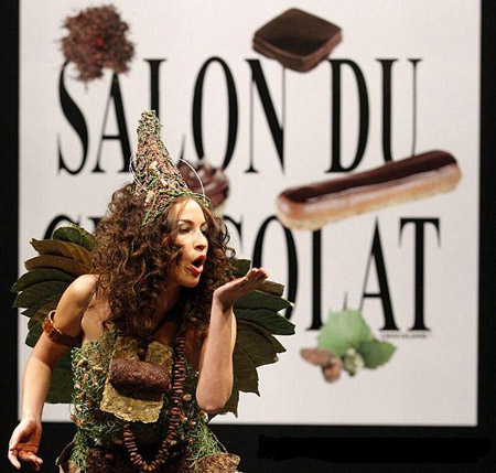 2008年10月28日,在法國巴黎舉行的第14屆巧克力展上,一名法國藝術(shù)家在展示一款用巧克力修飾的服裝。