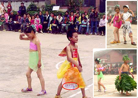 幾名小學(xué)生穿著有創(chuàng)意的服裝,利用廢舊報紙、綠葉等做成服裝道具,在一簡陋的校園操場上學(xué)著模特的貓步行走,淳樸天真的表演贏得了許多網(wǎng)友跟帖喝彩,稱“除了能宣傳環(huán)保,還能鍛煉、啟發(fā)孩子”,不過也有人并不認可。