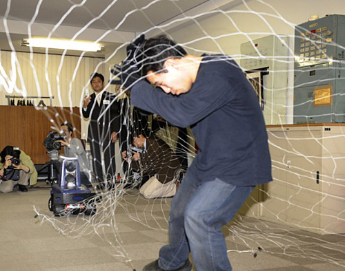 據(jù)英國(guó)媒體報(bào)道,日本一公司近日展示了一款保安機(jī)器人。這款改進(jìn)型保安機(jī)器人裝有新型傳感器,可以自動(dòng)發(fā)射網(wǎng)狀物將竊賊套住,并將現(xiàn)場(chǎng)圖像發(fā)到主人的手機(jī)上。