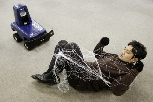 會抓賊的機器人:日本某公司展示的一款保安機器人,可以自動發(fā)射網狀物將竊賊套住,并將現場圖像發(fā)到主人的手機上。