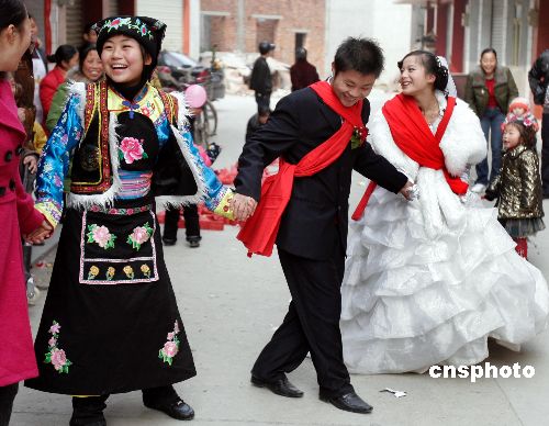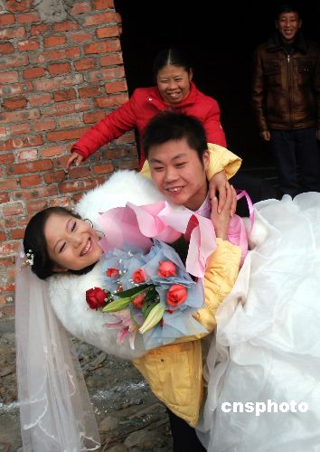1月22日,四川安縣永安鎮(zhèn)向陽(yáng)村村民袁磊與心上人在新近竣工的永久性住房?jī)?nèi)幸福完婚。據(jù)悉,在汶川地震中,袁磊家的房屋全部坍塌,政府補(bǔ)貼1.6萬(wàn)元后,自己又貸款5萬(wàn)元,在春節(jié)前建起三間新房,娶回新娘。