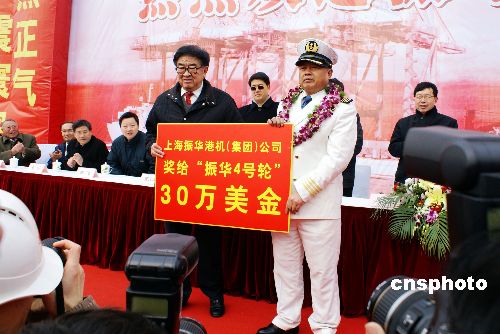 1月23日上午,上海振華港機(jī)集團(tuán)在長(zhǎng)興島基地為“振華4號(hào)”輪順利返航舉行盛大歡迎儀式,“振華4號(hào)”船長(zhǎng)彭維源帶領(lǐng)29名船員整裝首次集體亮相,并向眾媒體記者和現(xiàn)場(chǎng)來賓介紹了抗擊索馬里海盜的具體經(jīng)過。歡迎儀式現(xiàn)場(chǎng),振華港機(jī)集團(tuán)向每位船員頒發(fā)1萬(wàn)美元獎(jiǎng)金,并授予船長(zhǎng)“振華功臣金質(zhì)獎(jiǎng)?wù)隆。北京時(shí)間2008年12月17日中午,中國(guó)交通建設(shè)集團(tuán)所屬“振華4號(hào)”輪在途徑亞丁灣水域時(shí)遭遇2艘海盜船襲擊,有9名海盜登船,持沖鋒槍和火箭筒在甲板上與我船員對(duì)峙,我船上的30名船員用高壓水槍和自制燃燒彈自衛(wèi)并反擊。海盜在隨后趕來的國(guó)際救援軍艦直升機(jī)的威懾下,終于放棄攻擊,狼狽逃竄。中新社發(fā) 李根 攝