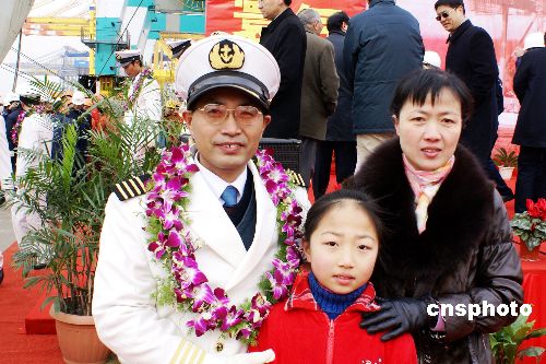 “振華4號(hào)”的輪機(jī)長(zhǎng)和妻女在碼頭相遇,她們母女倆特地從老家連云港趕來(lái)迎接。中新社發(fā) 李根 攝