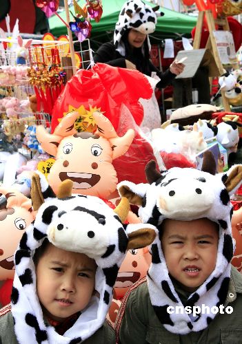 一月二十五日是中國農(nóng)歷大年三十,一對雙胞胎兄弟在香港年貨市場上頭戴卡通牛,惹人喜愛。中新社發(fā) 張勤 攝