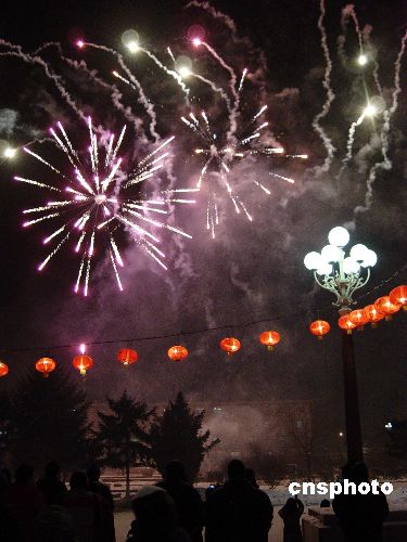 1月25日晚,農(nóng)歷除夕,中國兵器工業(yè)集團齊齊哈爾建華公司在廣場舉行迎春秧歌焰火晚會。中新社發(fā) 王云龍 攝