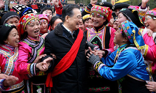 1月24日至25日,中共中央政治局常委、國務(wù)院總理溫家寶來到四川受災(zāi)最為嚴(yán)重的北川、德陽、汶川等地,和災(zāi)區(qū)人民一起過年。這是1月24日,溫家寶在北川縣擂鼓鎮(zhèn)貓兒石村看望羌族群眾。作者:姚大偉