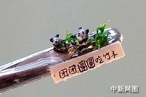 為紀(jì)念大熊貓團(tuán)團(tuán)、圓圓來(lái)臺(tái)與民眾見(jiàn)面。臺(tái)灣著名微雕家陳逢顯特在針孔上以樹(shù)脂創(chuàng)作“團(tuán)團(tuán)圓圓吃竹子”的作品。其中大只熊貓高0.5毫米,小只熊貓高0.4毫米。中新社記者:陳立宇 攝