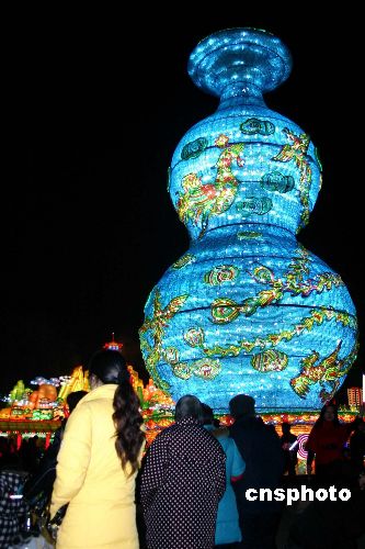 圖為由裝滿藍(lán)色液體的玻璃藥瓶綁扎而成的“天下第一瓶”,重逾12噸,色彩蔚藍(lán),9只鳳凰翱翔其上,令人神往。