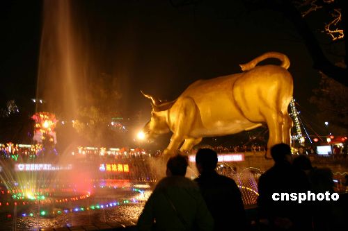 圖為比5層樓還高(25米長、16.8米高)的全牛皮仿真巨牛橫跨湖上,在燈光映照下熠熠閃耀金光,金牛叫聲響徹夜空,可謂“牛氣沖天”。中新社發(fā) 黃永莉 攝