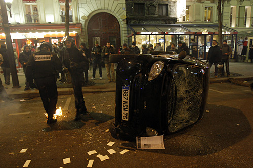 中新網(wǎng)1月30日電 法國全國有逾百萬人在29日罷工,抗議總統(tǒng)薩科齊處理金融危機的手法未能令工人受惠。在巴黎,示威演變成騷亂,示威者在商業(yè)大街擲玻璃樽和放火,更與警方爆發(fā)推撞,警方施放催淚氣體驅(qū)散群眾。