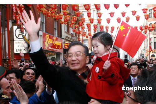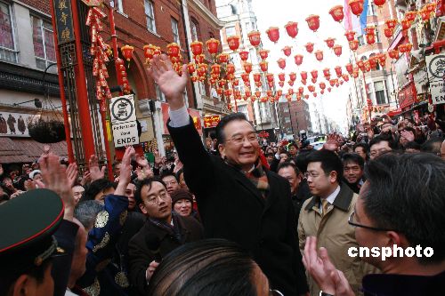 當(dāng)?shù)貢r間31日下午,中國總理溫家寶抵達(dá)倫敦后從機(jī)場直接前往唐人街,向華人華僑拜年。