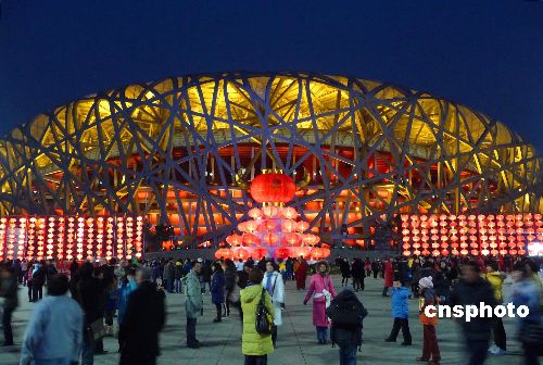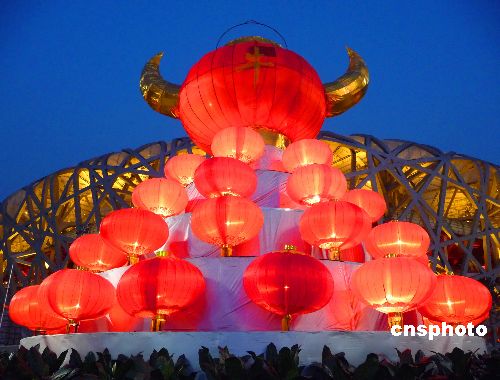 2009年1月31日傍晚,在北京奧林匹克公園中心區(qū)內,“金牛獻福”、“年年有余”、“鴻福滿倉”等鋼材結構的雕塑及數(shù)千個大紅燈籠,在牛年春節(jié)期間首次被安放在園區(qū)人流較集中的地方,與“鳥巢”、“水立方”交相輝映。中新社發(fā) 玉龍 攝