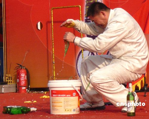 鐵砂掌擊碎啤酒瓶。中新社發(fā) 玉龍 攝