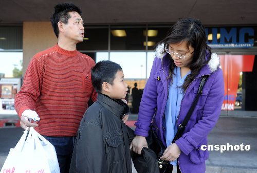 當(dāng)?shù)貢r(shí)間2月1日下午2時(shí)左右,遭遇車禍的吳守桂(左)、包瑞華(右)夫婦帶著八歲的兒子吳雙走出拉斯維加斯大學(xué)醫(yī)療中心(UMC),乘車前往酒店。吳守桂說,他們現(xiàn)在最大的心愿就是盡快回國,好好調(diào)整心理,繼續(xù)療傷。一月三十日下午,一輛載有中國游客的旅游車在美國亞歷桑那州發(fā)生車禍,造成七死十傷。吳守桂稱自己是不幸中的萬幸,一家三口是所有乘客中傷勢最輕的,夫婦倆昨天就出院了,今天八歲的兒子也順利出院。中新社發(fā) 張煒 攝